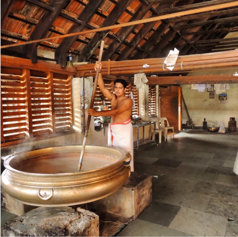 Być może ciśnie wam się na usta pytanie: co to za filozofia ugotować kleik? Cóż, przyrządzenie ofiary dla boga nie jest zwykłym gotowaniem, lecz prawdziwym rytuałem religijnym, trwającym niemal pięć godzin. Wszystko zaczyna się o świcie. W ogromnym, brązowym naczyniu zwanym varpu postawionym na ogniu miesza się wodę z mlekiem. Przez wiele godzin mleko gęstnieje, nabiera karmelowego koloru, a ryż stopniowo wchłania jego słodycz. Długi czas gotowania sprawia, że mleko powoli się karmelizuje – cukry i laktoza tworzą smak przypominający toffi lub karmel, a ryż nasiąka mlekiem i staje się niezwykle kremowy. To właśnie dlatego smak tego deseru tak bardzo różni się od zwykłego kheeru przygotowywanego w pośpiechu w domowej kuchni.